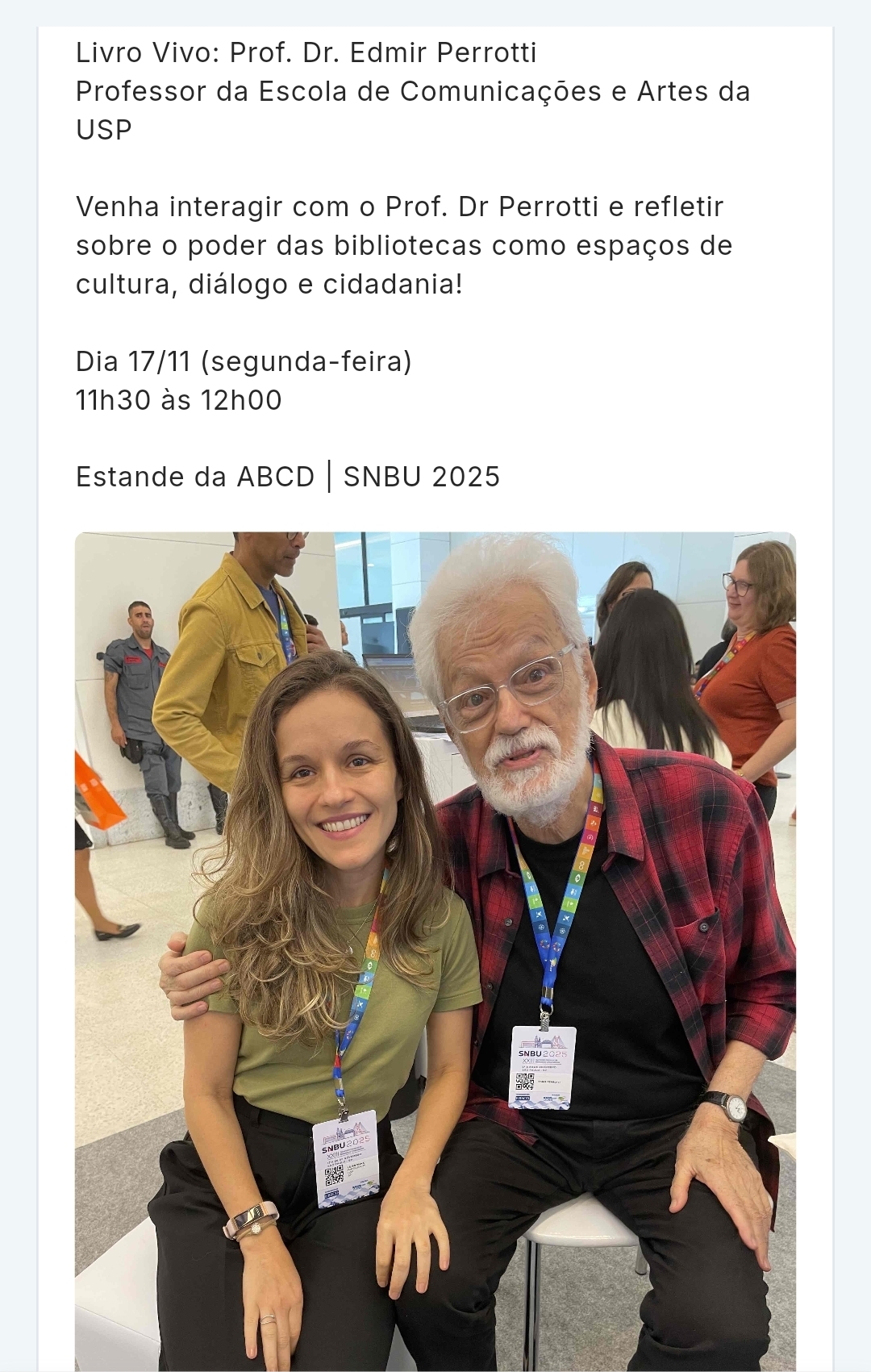 A Agência de Bibliotecas e Coleções Digitais (ABCD-USP), anfitriã do 23º Seminário Nacional de Bibliotecas Universitárias (SNBU 2025), realizado entre os dias 17 e 20 de novembro de 2025 no Centro de Convenções Frei Caneca, em São Paulo, promoveu com grande sucesso a atividade “Biblioteca Humana“ em seu estande.Com o tema “Diálogos que Inspiram, Experiências que Transformam”, a Biblioteca Humana funcionou como um espaço de encontro e diálogo, onde os participantes do seminário foram convidados a “ler” histórias humanas e compartilhar experiências com os palestrantes e profissionais (“Livros Vivos”).